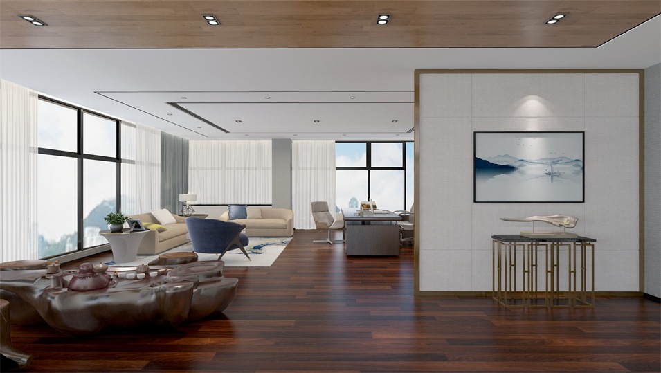 设计介绍:主要展示前台、洽谈区、走廊、贵宾区、会议室、办公区等各个区域实物图,设计师们采用现代简约风格办公室设计,主要以白色为主,蓝色更符合智能化科技的公司形象,通过几何图形与条纹装饰打造科技智能的办公空间。