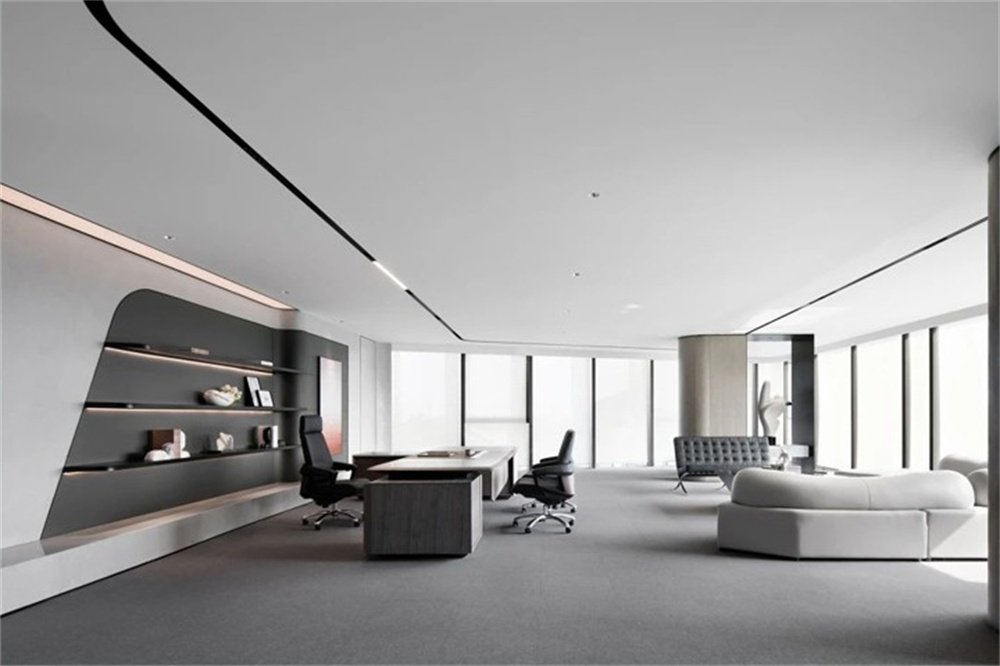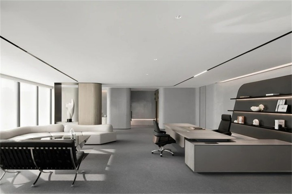 4、商务稳重 一般来说,老牌的大型集团公司的董事长办公室设计一般采用稳重凝练型办公室装修风格,造型上比较保守,方方正正,选择考究,强调气质的高贵和尊威。