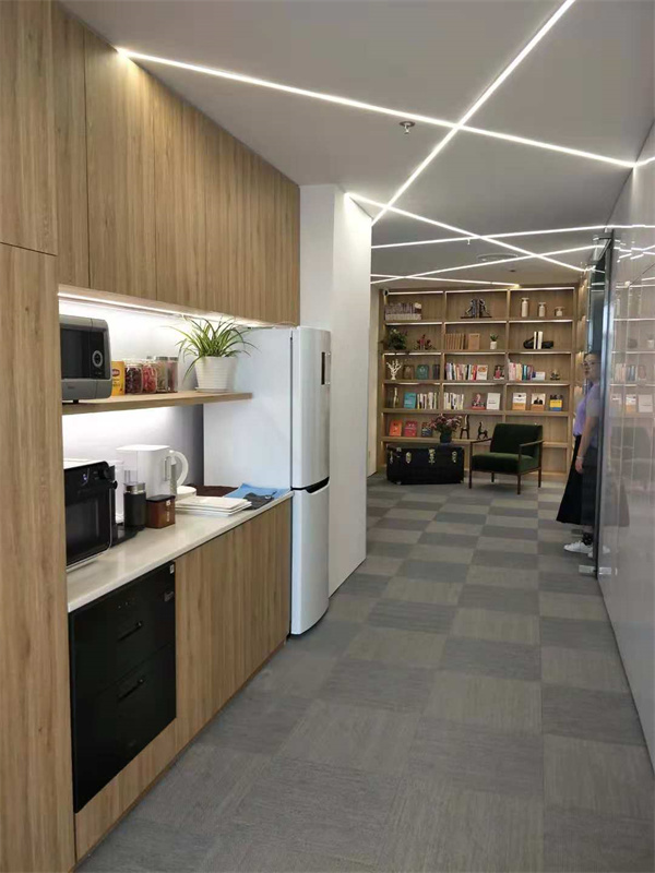 4、办公室装修地面材料首先可以根据原始交付条件选择地面材料,上海办公室装修常规交付标准为架空地板交付,这种情况下建议选择地毯、pvc地板等材料,如果地面原始为毛坯或原始留有一定高度差,这种情况地砖。木地板等也是不错的选择。另外不同的区域地面材料也有不同的选择,比如茶水区建议选择相对防水些的材料,容易清理些。