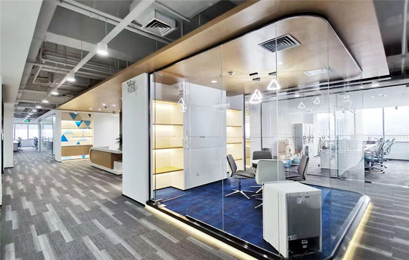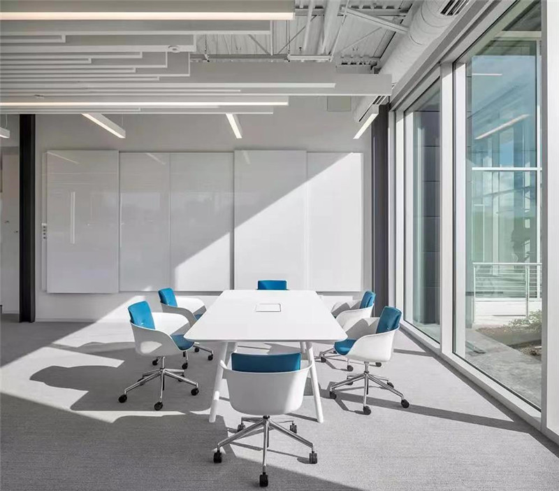 3、最后洽谈室需要有一定的私密性,有时有客户在洽谈室会议时,如果私密性不好也会让人产生戒备的心理。所以洽谈室如果使用了玻璃隔断可以玻璃贴膜,或者墙面使用一半石膏板一半玻璃隔断结合的形式来增加空间私密性。洽谈室的空间色彩也可以使用不同于会议室的的活跃、明亮的多种颜色让空间更加放松。