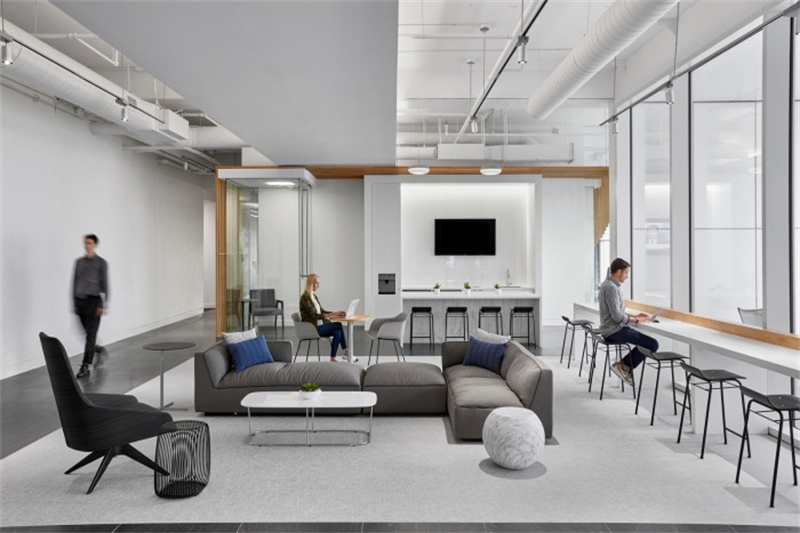 首先公共办公区和茶水休闲区是办公室中不可缺少的一部分,一般来说办公室设计的茶水休闲区要么是单独的一个房间,要么因为空间较少的原因就将休息区和公共办公区并在一起。但是如果茶水休闲区是开放的话,有些人若是需要小憩一会因为茶水休闲区没有隔音所以导致茶水休闲区的休息效果不是很好。所以针对这种情况我们可以使用由滑动式木质门制成的履带式滑动面板作为活动隔断,使用的时候拉出来使茶水休闲区作为一个独立空间,不使用的时候也可以推到一起让公共办公区看起来更大,其不仅不占空间节省隔墙花费,也能够让休息室的隔音与休息效果更好。