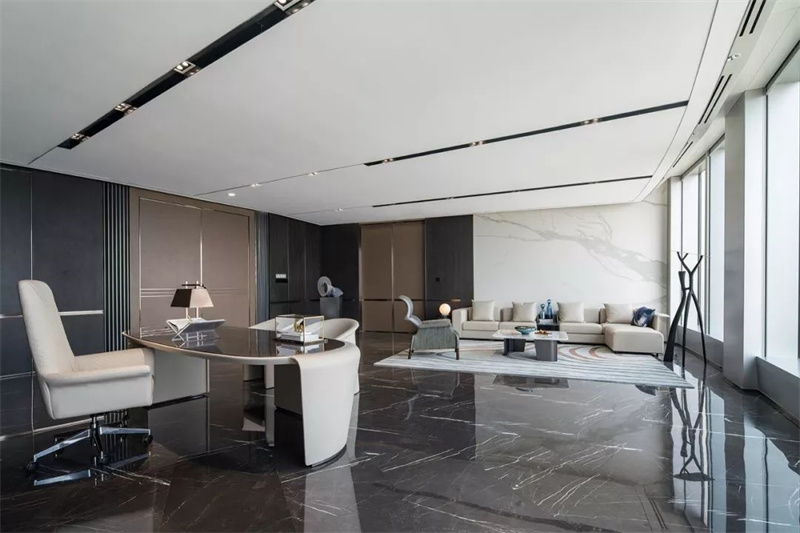 对于办公室吊顶的设计理念,往往设计为部分层叠吊顶和部分吊顶吊顶。这种造型设计方法是将部分管线、工程建筑梁或照明灯做成造型吊顶,而保留其他部分的原工程建筑吊顶多用于楼层较低但相对规整的工程建筑梁的室内空间,因为对布线管线进行合理有效的装饰后,仍能最大限度地利用原工程建筑的高度。这种吊顶造型不仅要注意造型吊顶与原工程建筑吊顶的和谐关系,还要注意吊顶、地面与建筑立面的关系。